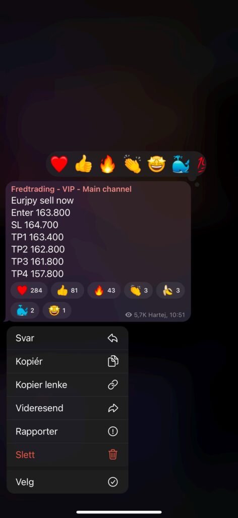 EURJPY is a currency. Here it says Sell now, which means that you must enter a sale, NOT a buy. It also says 163,800 is the entry price, so if you see this message a little late, it might be worth checking what it is now. If the price has moved down to TP1, which is 163,400, it may be too late to enter a sale. Then the risk will be g eater. It is not always normal for the course to g o to TP2, TP3 and TP4. TP1 is the amount you must enter on take profit above, which is 163,400. Then the sale ends when the rate reaches this amount. Should the course g in the wrong direction, you must also enter SL, which is the Stop Loss, which is 164,700. Then you reduce the risk of losing the money.